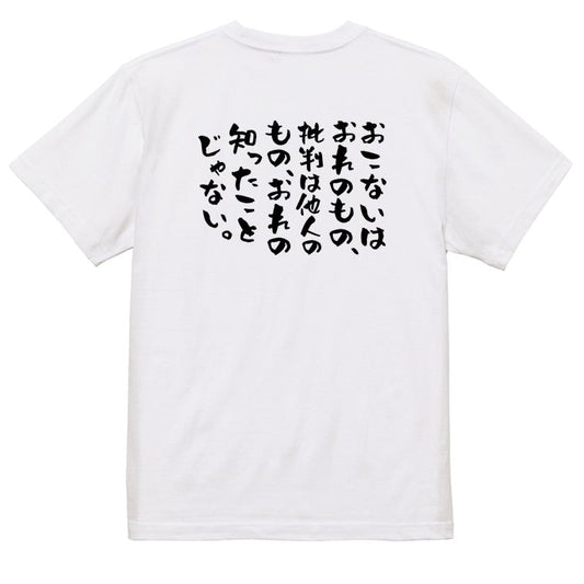 ポジティブ系半袖Tシャツ【おこないはおれのもの、批判は他人のもの、おれの知ったことじゃない。】おもしろTシャツ ネタTシャツ