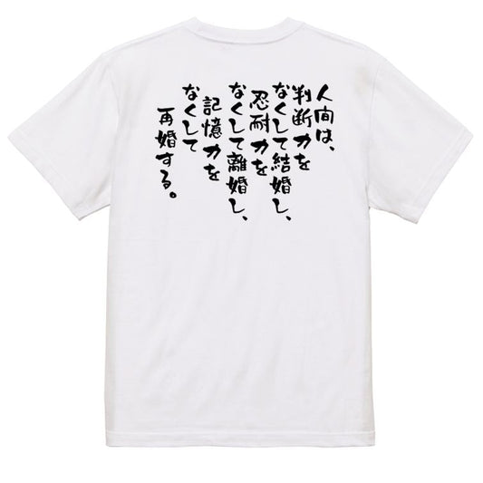 名言系半袖Tシャツ【人間は、判断力をなくして結婚し、忍耐力をなくして離婚し、記憶力をなくして再婚する。】おもしろTシャツ ネタTシャツ