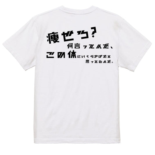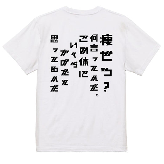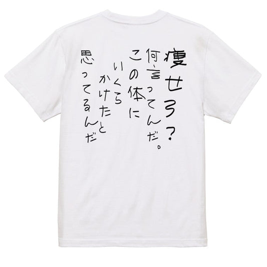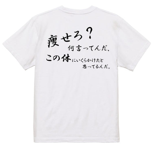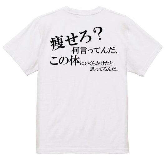明朝体デブ系半袖Tシャツ【痩せろ?何言ってんだ。この体にいくらかけたと思ってるんだ(横)(明朝体)】おもしろTシャツ ネタTシャツ