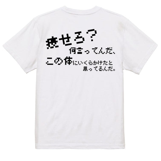ファミコン風デブ系半袖Tシャツ【痩せろ?何言ってんだ。この体にいくらかけたと思ってるんだ(横)(ファミコン文字)】おもしろTシャツ ネタTシャツ